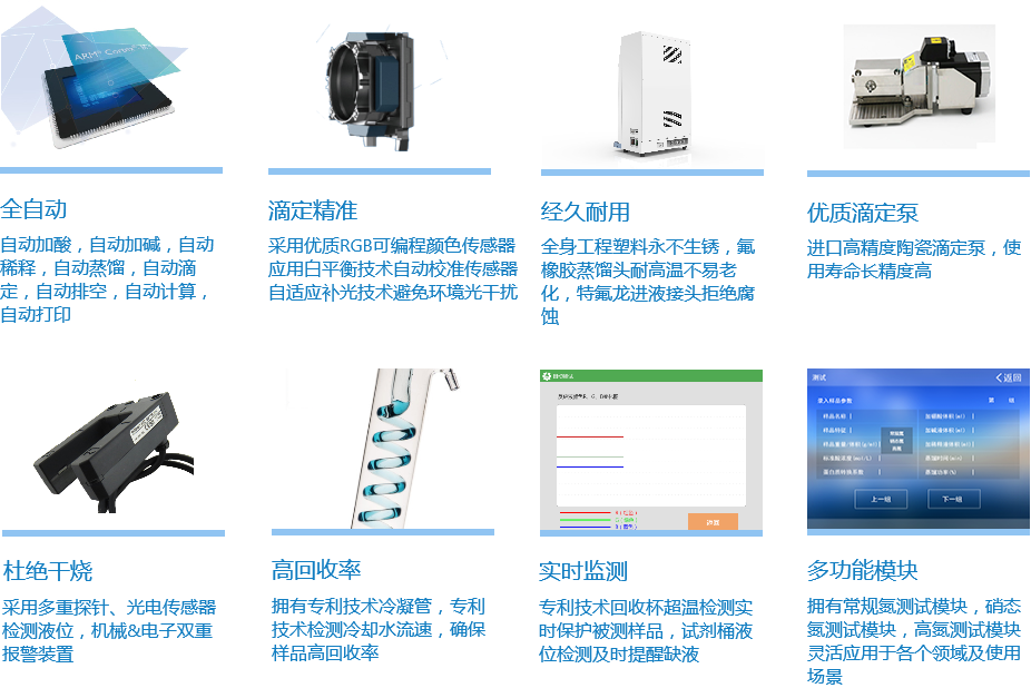 NKY6160凱氏定氮儀采用智能化程序設計,不但具有全程自動加酸、加減、稀釋和自動清洗功能,同時實現樣品在堿性條件下將銨鹽轉化為氨的自動蒸餾;而且在程序設定條件下通過高精度微量計量泵自動完成標準鹽酸滴定,通過RGB可編程光學傳感技術自動判定到達滴定終點,從而計算出樣品中氮的含量。該產品已成為食品企業、農林漁業、高等院校、科研機構、質量機構等部門的重要理化分析儀器。