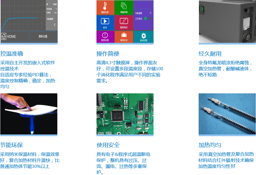 XTG5480紅外消解儀采用電熱絲復合真空加熱技術,升溫效率高,溫度均勻性好。采用行業領先的納米云隔熱材料,熱效率高,節能環保。更具有4.3寸高清LCD觸摸屏操控界面,簡單易懂,并具實時顯示溫度曲線功能,摒棄了以往溫控表頭繁瑣的操作。